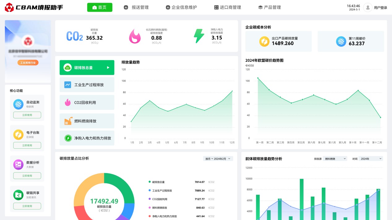 2023年10月1日起,歐盟碳邊境調(diào)整機(jī)制(CBAM)已進(jìn)入過渡期,CBAM涵蓋范圍的出口產(chǎn)品需按時提交產(chǎn)品碳排放報告,未提交報告的企業(yè)將面臨高額處罰。為解決企業(yè)由于官方政策文件理解難度大,專業(yè)門檻高,數(shù)據(jù)搜集難度大,部分?jǐn)?shù)據(jù)缺失無法填等困擾,推出碳關(guān)稅管理平臺(CBAM填報助手),通過數(shù)字化方式,為企業(yè)提供碳數(shù)據(jù)填報、碳數(shù)據(jù)核算、碳數(shù)據(jù)報送、碳數(shù)據(jù)認(rèn)證、咨詢培訓(xùn)等全流程服務(wù)??蓸O大減少企業(yè)碳排放報送門檻,助力企業(yè)低成本合規(guī)報送碳排放數(shù)據(jù)。